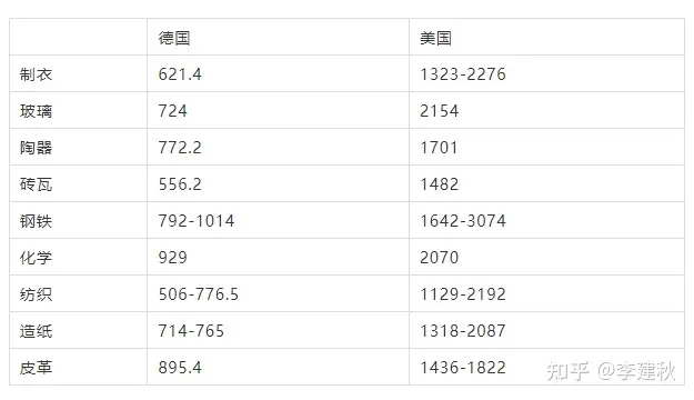 这是桑巴特 + 根据 1900 年的德国和美国之间的各部门工人工资的对比(单位马克):