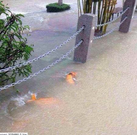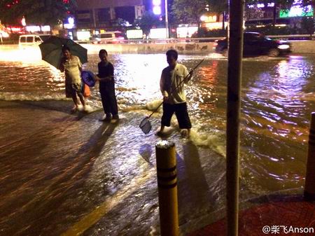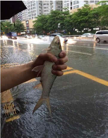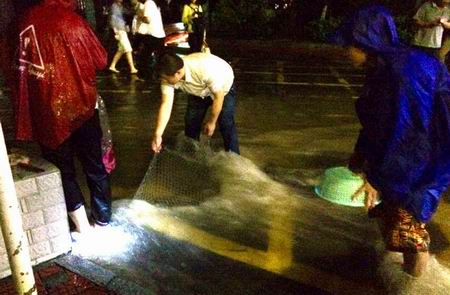 11日,深圳遭遇2008年以来的最强暴雨,导致当地出现约150处道路积水,20处片区发生内涝,5000多辆公交车无法正常运营,2000辆汽车被淹,深圳机场累计取消进出港航班48个,目前暂无人员伤亡报告。图为民众当街捉鱼。