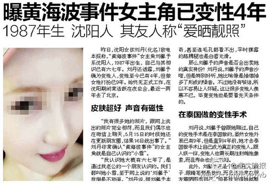 据辽沈晚报消息,昨日,沈阳女孩刘丹(化名)致电本报称“黄海波(微博)事件”女主角刘馨予系沈阳人,1987年出生,自己与其相识已有六七年。刘丹还透露,刘馨予确为变性人,变性至今已有4年,但做女性打扮已9年,始终无正式工作,在沈阳期间常活跃在夜总会,最近一两年去了北京。