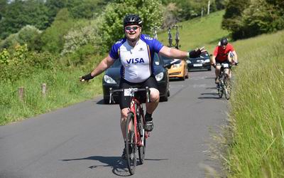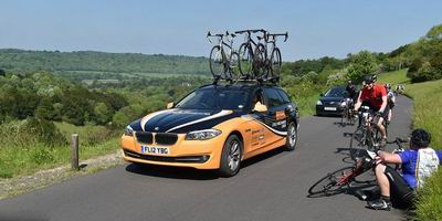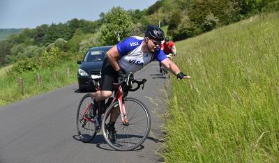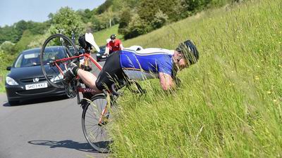 在近日英国举行的公路自行车赛上发生了令人忍俊不禁的一幕:一名选手在即将到达终点时为表达即将夺冠的喜悦,双手离开自行车作飞翔状,结果意外失控,人车均跌入公路旁的草丛中,被后来者追上,最终与冠军失之交臂。