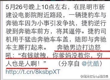 原帖由 mj982 于 2014-6-5 10:09 发表 呢件事的真实版本系开捷豹的撞到一个路人后逃跑,奔驰车主见到,立刻开车追上去,截停部捷豹,根住就出现左以上的一幕,穷人不是人啊~~