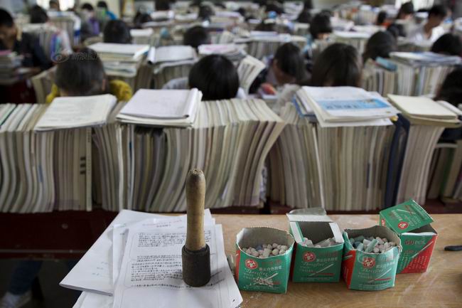 汝南高中是豫南一所建校百年的老牌学校,在日益残酷的高考竞争面前,学校竭尽所能激励学生。2014年5月15日,一只体育课上投掷用的手榴弹被放在一个班级的讲桌上。在高考这场旷日持久的“战争”里,学生们说,三年高中,他们每天都象战士一样,时刻准备着去“打仗”。