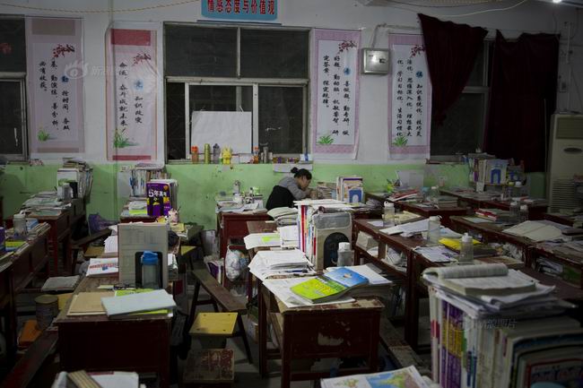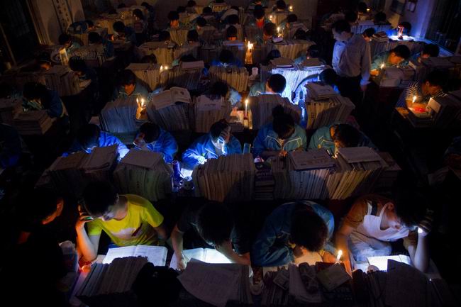 2013年5月5日,汝南高中,晚自习期间,停了电,学生们借助各种灯具的光亮坚持学习。在学校里,所能感受最强的只有学习的气氛,埋头苦读成了自习课上每个班级共同的景象。