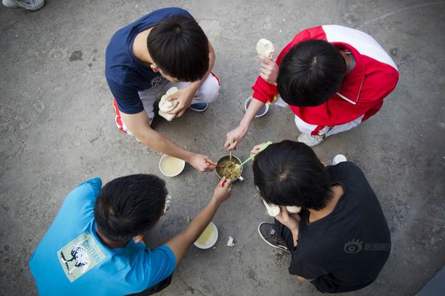 汝南高中,四个聚在一起吃早饭的学生。地处县城的高中,大多数学生来自农村,平时都要住校,生活也相对清苦。但“寒窗苦读”渴望“知识改变命运”的农村孩子,拿青春赌注高考,有着更多城市孩子难以想像的艰辛。