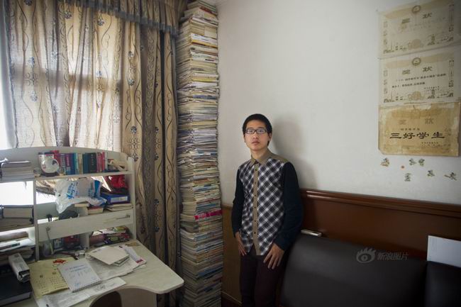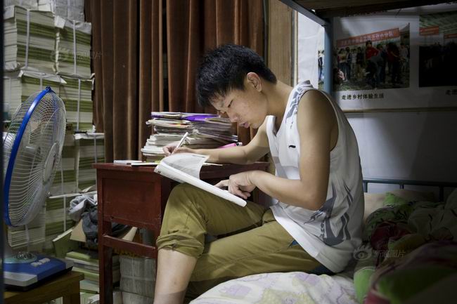 汝南高中502班学生陈军峰在宿舍查阅报考资料,全校理科第一名的成绩为他带来了“开小灶”的特殊待遇,居住在学校校史馆里的一间资料室,有了更多时间不受干扰地专心学习。