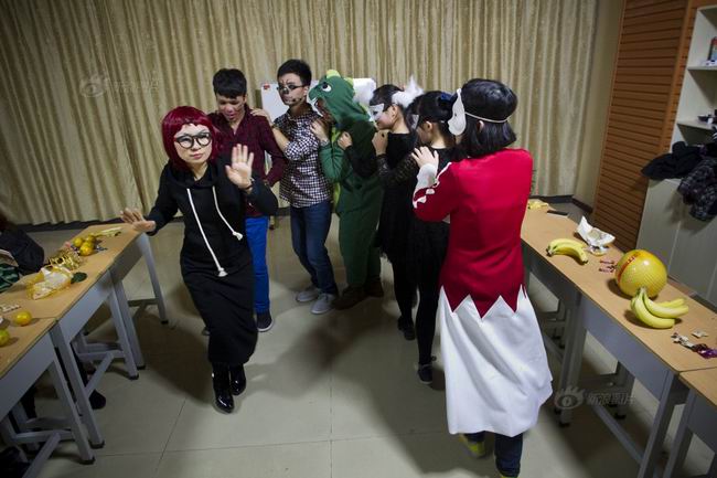 驻马店一中国际班的学生正在老师LISA的带领下进行万圣节游戏。这些家境相对比较好的学生在这个班上主要学习外语,将来会通过各种渠道进入外国上大学。
