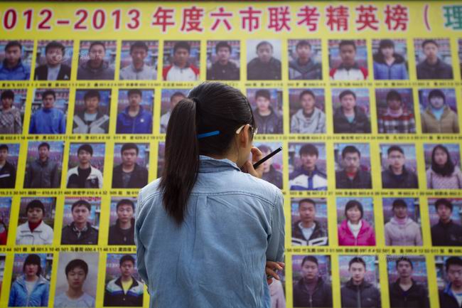 汝南高中,一位女生站在学校张贴的六市联考精英榜前。为了应对高考,高三阶段,学校常常会组织各种类型的考试,各个地市各个学校之间还会联合起来,组织更大规模的模拟统考。高考越近,考试越密集,在走上高考的正式考场前,学生们早已是身经百战。