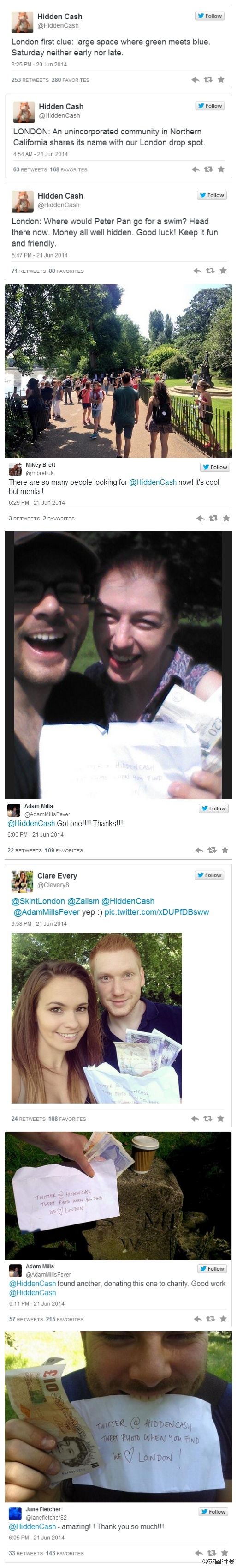 美国富豪Jason Buzi觉得自己钱赚的太多,想回馈社会,前一阵在美国街头“藏钱”,让大家去找,半个月送出去1万多美元,现在他又跑英国来藏钱了,通过自己的推特账户"hidden cash"公布藏钱地点的小线索。。感觉伦敦的人找钱找的好HAPPY。。。