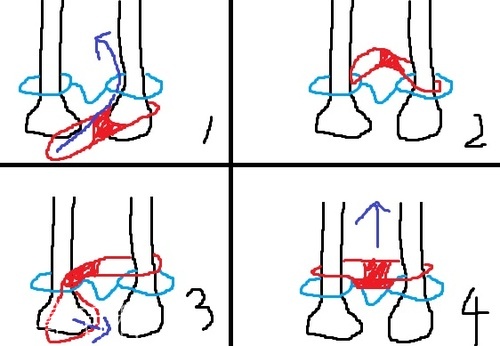 然后将还未进腿的内裤部分拉至另一只腿,把这部分沿着这只光腿往下拽,拽至箍她这只腿的铁环处,从铁环和肉之间的缝中继续往下挤出去,只要挤出的部分足够多,拉至脚指处,就可以让这只脚穿进内裤。穿进后,再把这部分内裤从铁环和腿间的缝中拉回来。