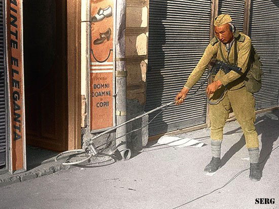 在城市街头扫雷的苏军士兵