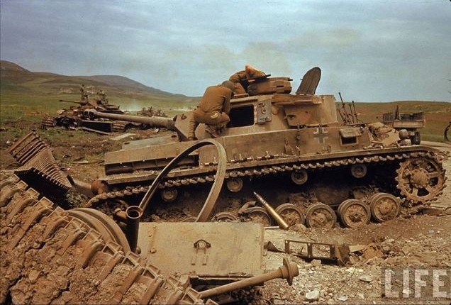 北非战场美军士兵正在检查被击毁的德军IV号装甲车