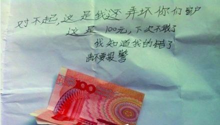 ——【继“十动然拒”之后,又有“收百然警”。8日广东番禺的胡先生收到一封道歉信和100元,随后发现家中纱窗被划开,窗台有脚印。尽管小偷道歉求情,胡先生还是报了警。难道这就是传说中的盗亦有道?】