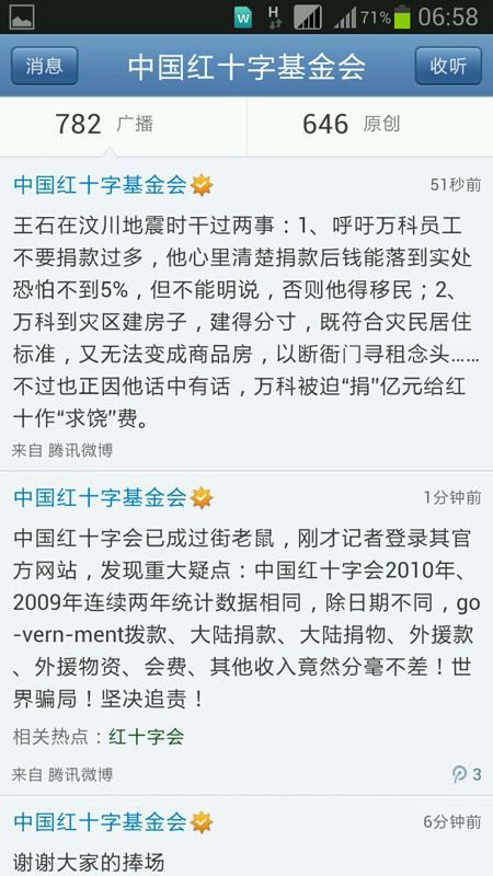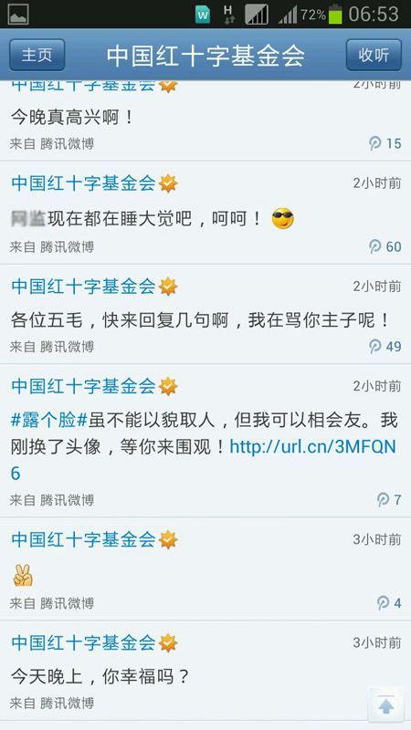 ——【11日凌晨5时左右,“中国红十字基金会”官方微博被黑,之后近4个小时里共发出40余条微博,内容多为"自揭黑幕",并称“今晚真高兴啊!”网友反响强烈,纷纷与之互动。】