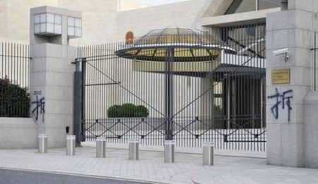 ——【2013年7月10日凌晨,三个涂鸦“拆”字出现在中国驻美大使馆院子大门的门柱上和办公楼的入口处,美国媒体对此分析。网友则称“写的不专业,没有划圈。”】