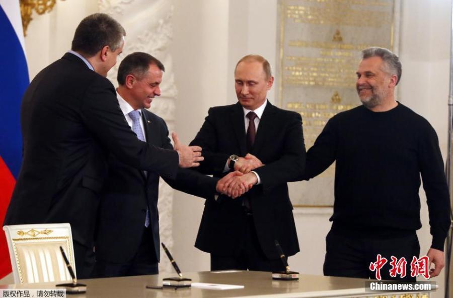 人民网莫斯科3月18日电 (记者 刘旭)3月18日,俄罗斯总统普京与克里米亚总理谢尔盖·阿克肖诺夫、克里米亚议会主席瓦列里·康斯坦丁诺夫、塞瓦斯托波尔市人民市长阿列克谢·恰雷在克里姆林宫签署关于克里米亚和塞瓦斯托波尔加入俄罗斯的协议。