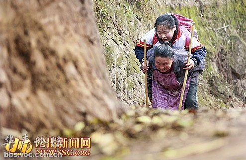 66岁老人拄拐背残疾孙女上学,8年6000里山路泪,四川宜宾南溪区的向其友婆婆已66岁高龄,孙女邱方梅患膝盖畸形,两岁半时,孩子母亲改嫁,父亲离家出走。为了送孙女上学,自己都需要拄拐杖的向奶奶每天都要背孙女走上1个半小时。这一背就是8年,6000多里山路。