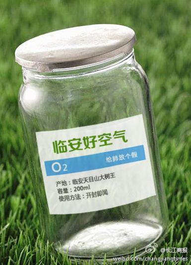 @长江商报:【200毫升每瓶10元 临安要卖好空气】现在到处是雾霾,空气这么差,你的肺还好么?要不要买罐临安的空气尝尝!临安市旅游局最近计划推出首批来自天目山的"临安好空气",200毫升一瓶,初定每瓶10元。买回家后,打开瓶口,用鼻子深吸,就能将天目山的新鲜空气吸进心肺