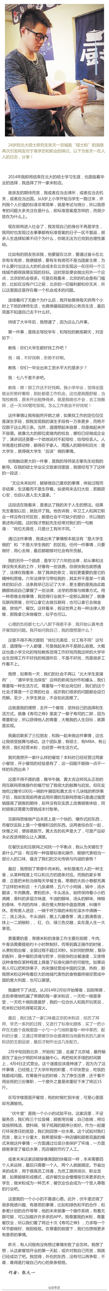 【北大硕士毕业生自述:我为什么卖米粉】从上小学开始,评判我个人价值的标准就是考试与得分。即将踏入社会,我发现过去事事都有标准答案的日子一去不复返。"岗位无高低,只是分工不同。"没有"是大学生做的"和"不是大学生做的"的区别。…这就是我的理想,去开一个餐馆,坚持自己的选择和生活方式。