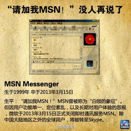 @央视新闻:【今天,纪念曾陪伴我们的网络"小伙伴"】1994年4月20日,20年前的今天,中国接入国际互联网。①2002年,中国博客网删除免费用户数据 ②2006年,被网友痛批的3721遭弃用 ③2013年,人人网关闭开心农场 ④2013年,MSN软件消失 ⑤前几天,"快播模式"终结……戳图看消失的网络产品。转!你用过哪些?