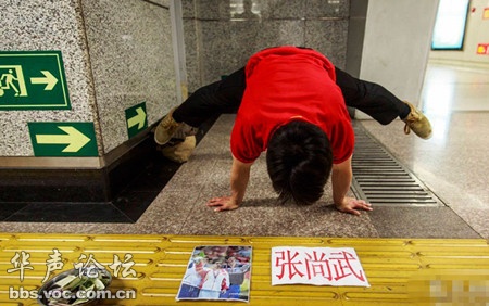 以张尚武的名气,以及之前社会各界的呼吁,完全不应该再在街头卖艺求生。然而,4月19日晚,北京东直门地铁站地下通道内,中国前体操运动员张尚武再次现身卖艺赚钱,昔日冠军失魂落魄街头卖艺乞讨艰难求生,就让人有说几句的必要。从爆料的图片看,张尚武身穿红色短袖T恤,衣服上面还印有五星红旗和“中国”字样,引起不少记者模样的人围观拍照。老实说,张尚武再现街头卖艺让我越看越模糊!