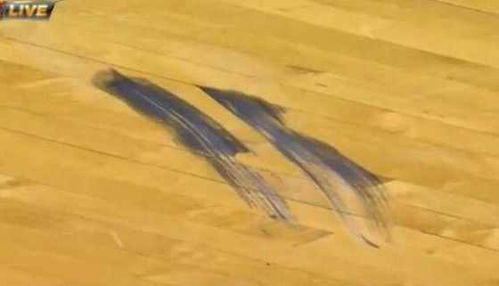热火时,迎战勇士。詹姆斯速度太过迅猛,在比赛战场留下的急刹车痕迹、