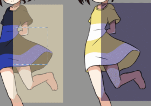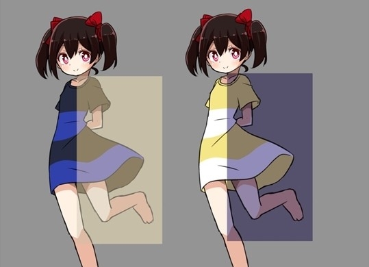 事实上,在左边的女孩被设定的外在环境是明亮的光照,而右边则是阴暗处。光线的变化让蓝黑裙子转变成了互补色白黄。