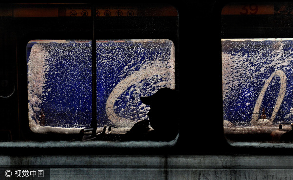 2014年3月3日,马里兰州被大雪围困的火车,唯一的乘客在等待清除轨道的积雪,背后的蓝色背景是货运火车的集装箱 / 视觉中国