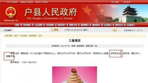 近日有网友发帖称,政府网站本应严肃,但他在陕西户县人民政府的网站上看到了夜总会和歌舞厅的广告。对此,户县人民政府回应,这是由于网站前段时间改版出现的问题,目前此消息已被删除。