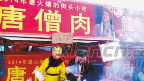 昨日上午,记者在延安市百米大道年货一条街看到,一家主营烤肉串的风味小吃摊前围了很多人,其中小孩子尤多。两名分别装扮成“孙悟空”和“猪八戒”造型的男子,手持烤肉串手舞足蹈,嘴上还念念有词:“新鲜唐僧肉,10元6串。”记者注意到,小吃摊顶部和底部均挂着“2014年最火爆街头小吃——唐僧肉”的招牌,并喷绘有86版电视剧《西游记》中的唐僧造型。围观人群中,有人一副无所谓的神态,手持肉串吃得津津有味,而有人却极为不满,责备摊主:“这徒弟也太大逆不道了,这肉我们不吃。”