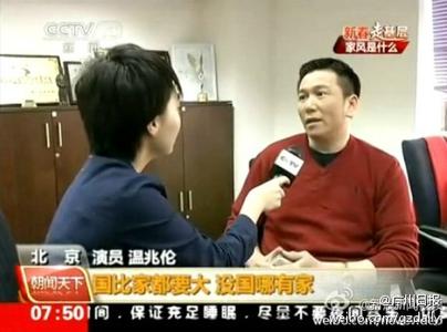 春节期间,央视“新春走基层”又派出多路记者在全国各地采访“家风是什么”。记者还来到著名香港歌星温兆伦家中,在谈及家风时,温兆伦说,让他印象最深的,是奶奶常教导他,退一步海阔天空,中国人必须团结在一起,国家才会强大!“国比家大,没有国哪来家?”