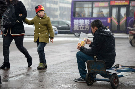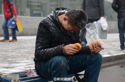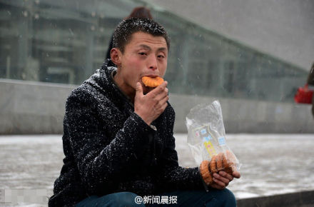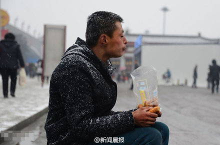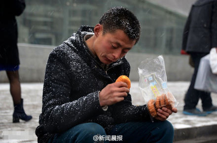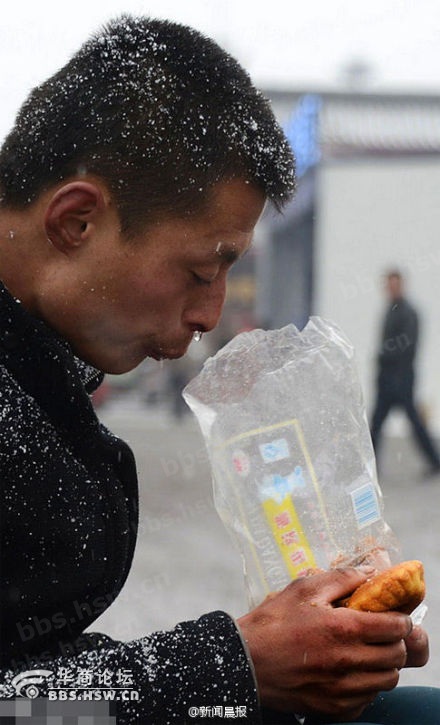 这是网友“严建设”在西安火车站东广场拍摄到的一组照片:一位年轻的农民工兄弟,正拿着蛋糕大口吃,他脸色蜡黄直流鼻涕,还在咳嗽,偶尔哆嗦一下。想是感冒了,但为了谋生,不得不节省吃饭时间,冒着风雪坐在铸铁老虎车上等生意。