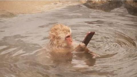猴子拿手机泡温泉照爆红网络