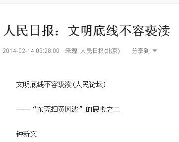 ——【人民日报近日连续发出评论文章,批评当前一些支持东莞黄色事业的舆论,是偏离主流价值观的做法。】