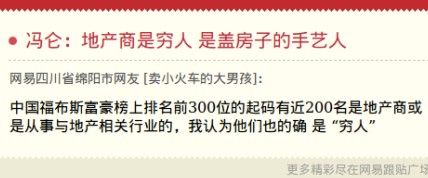 ——【万通公司董事长冯仑近日出席一个企业家论坛时指出,地产商并非直接受惠于房价上升的一方,因为造好的房子卖出去后升值,得益的是业主。】