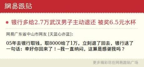 ——【武汉一名市民老陈日前到银行取钱时,柜员因失误多给了他2.7万,后来他主动退还。银行方奖励了一个价值6.5元的水杯以示鼓励。对此,该银行的邱经理强调,归还银行多给的钱,是作为一个公民应有的法律义务和底线。】