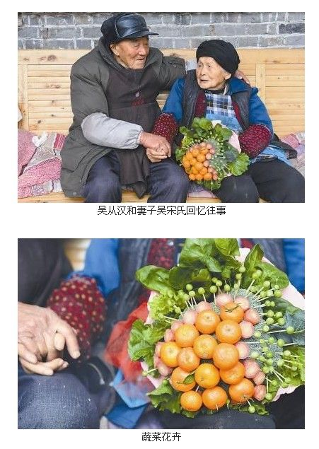 ——【四川南部县一对百岁夫妻近日受到关注。媒体报道,103岁的丈夫吴从汉送给他的105岁的妻子一束新鲜的“蔬菜花卉”,庆祝他们结婚90周年。吴从汉的儿女透露,感情恩爱是他们的父母长寿的秘诀。】