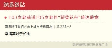 ——【四川南部县一对百岁夫妻近日受到关注。媒体报道,103岁的丈夫吴从汉送给他的105岁的妻子一束新鲜的“蔬菜花卉”,庆祝他们结婚90周年。吴从汉的儿女透露,感情恩爱是他们的父母长寿的秘诀。】    13岁  15岁就结婚的饿。。。