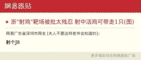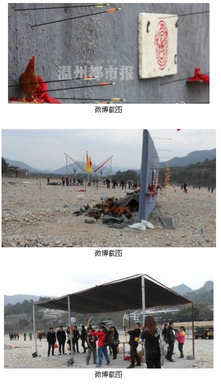 ——【最近,温州市某风景区出现一个“射鸡靶”的游戏摊位,把活蹦乱跳的鸡绑在木板上做靶子,让游客对“鸡靶”进行射击。有关部门目前已制止了有关活动。对此,温州绿眼睛环境组织负责人方先生表示“射鸡靶”活动极为残忍。】