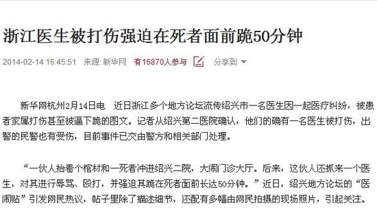 ——【近日绍兴市一名医生因一起医疗纠纷,被患者家属打伤甚至被逼下跪50分钟。绍兴第二医院相关负责人表示,一消化科医生被打伤,出警的民警也有人受伤。】