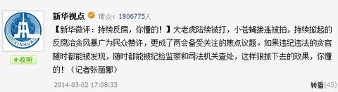 大老虎陆续被打,小苍蝇接连被拍,持续掀起的反腐治贪风暴广为民众赞许,更成了两会备受关注的焦点议题。如果违纪违法的贪官随时都能被发现,随时都能被纪检监察和司法机关查处,这样狠抓下去的效果,你懂的!