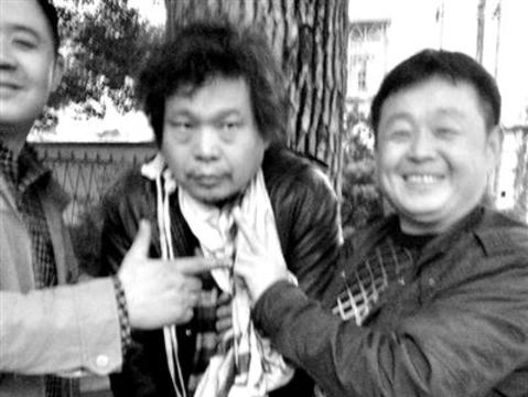 两名接访人员与患有癌症的访民段新德合影时,面带笑容摆出胜利的手势。。