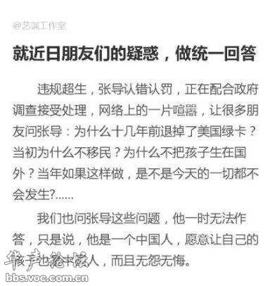 张艺谋不愧是著名的导演,相当的擅长煽情,一句“自己是一个中国人,愿意让自己的孩子也是中国人,而且无怨无悔。”的声明,言下之意其超生都是基于爱国