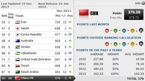 FIFA年终排名:国足升至92名!