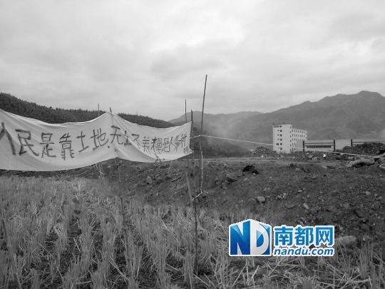 在余吉兴试图被推土机轧死的现场,已被征收的农田正进行施工,进行土方填满。尚未被征收的农田,则被白色绳子圈起,其中一块农田竖着村民在白布上写的标语:“人民是靠土地,无土不养人,粮是人第一科脉”。