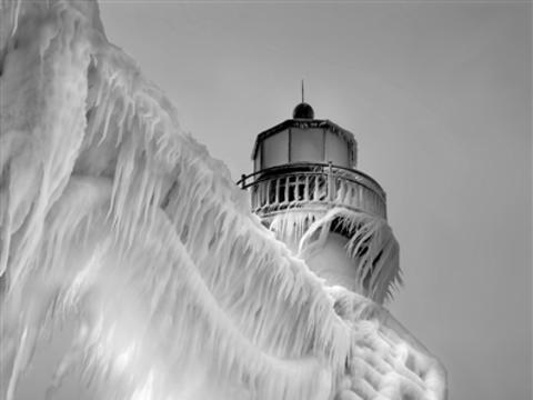 密歇根州,一处灯塔被暴风雪冰封,像极电影《后天》中场景。