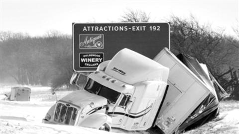 伊利诺伊州,一辆拖挂卡车倒在雪地中。