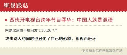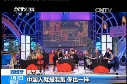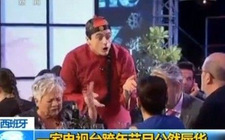 ——【西班牙电视5台跨年晚会有个小品,把场景设置在中餐馆内,一个西班牙人穿唐装梳辫子扮成华人服务员,表演极尽夸张,丑化华人形象,而且小品还公然出现侮辱中国人的台词,在西班牙华人群体引起极大愤怒。】