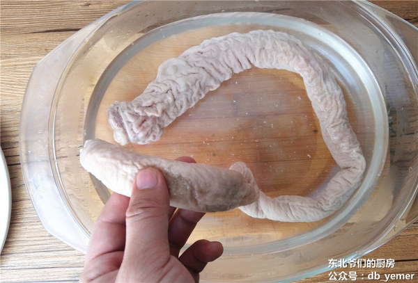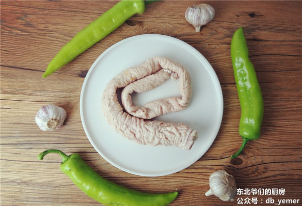 东北人做溜肥肠习惯用绿尖椒爆炒,选择肥肠最好的位置便是大肠头,想想这位置,各种与美食不搭调。但在农村,往往这都是帮忙杀年猪的师傅要带走的犒 劳,一般想吃还吃不着呢。新鲜的肥肠固然好,但在今天的城市里,能有勇气买回来自己清洗收拾的人真不多。清洗肥肠要用面用醋翻过来搓的方法,我就不多说 了,一般定力的人洗完了基本也没兴趣吃了,我承认我也从不买新鲜的肠子自己处理,都是直接在市场买煮好的肥肠回家做。市场上的肥肠处理的很干净,而且煮的 也很到位了,但是在大批量制作的过程中,一般是要放碱的,这样清洗方便。所以我们买回来煮好的肥肠,可以先用温水滴入几滴白醋浸泡 10-20 分钟,这样就比较安全了。