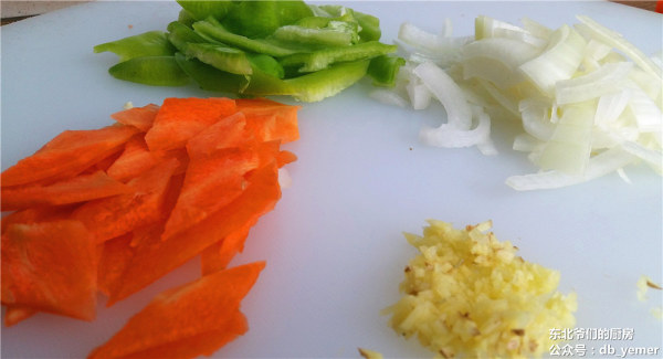 (3)绿尖椒去柄去籽,纵向剖开后切菱形片。尖椒要选硬挺皮薄的,一定要辣,越辣越有滋味,东北尖椒是像香蕉一般形状粗细的辣椒,不是那种像杭椒般细长的那种。然后姜蒜切末,这里蒜末要备上两份。胡萝卜切菱形片、洋葱切条。
