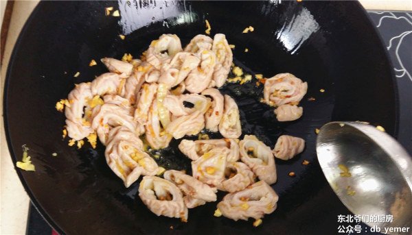 (4)热锅起油,放入姜末和一份蒜末爆香,然后放入肥肠大火爆炒 1-2 分钟左右。